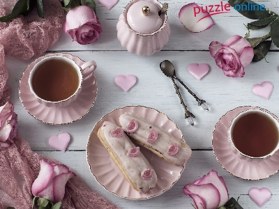 Cukierniczka, Róże, Herbata, Filiżanki, Ciastka