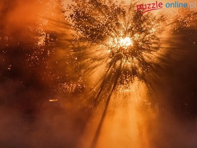 Puzzle Mgła, Przebijające światło, Słońce, Drzewa