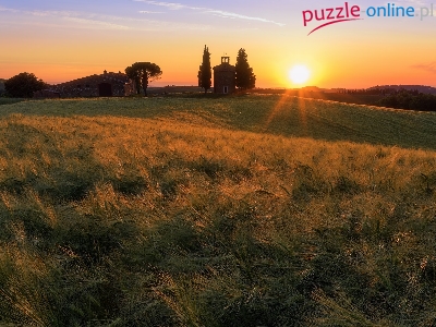 Zboże, Włochy, Zachód słońca, Dom, Dzwonnica, Pole, Wieża, Toskania