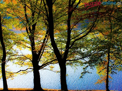 Puzzle Liście, Drzewa, Kolorowe, Jezioro
