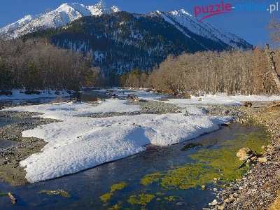 Kaukaz, Rosja, Śnieg, Rzeka Psysh, Drzewa, Góry, Kamienie, Republika Karaczajo-Czerkiesja