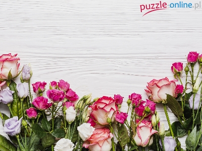 Puzzle Drewno, Róże, Eustoma, Deska
