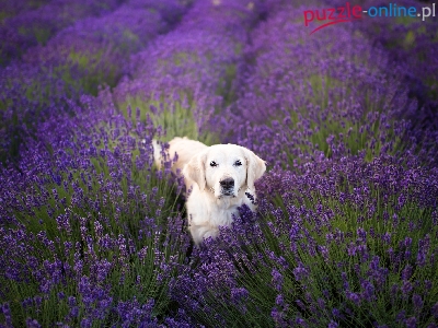 Puzzle Kwiaty, Pies, Golden retriever, Lawenda