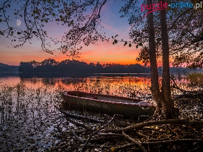 Łódka, Księżyc, Jezioro, Drzewa, Zachód słońca