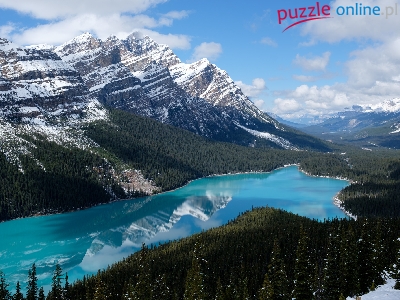 Jezioro Peyto Lake, Kanada, Chmury, Góry, Drzewa, Park Narodowy Banff, Las, Prowincja Alberta