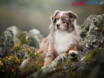 Puzzle Rośliny, Owczarek australijski, Skała, Rozmyte tło