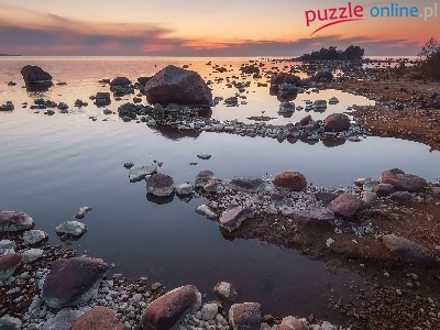 Zachód słońca, Łódka, Morze, Brzeg, Kamienie