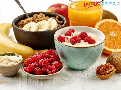 Płatki, Pomarańcza, Sok, Banany, Śniadanie, Maliny, Orzechy