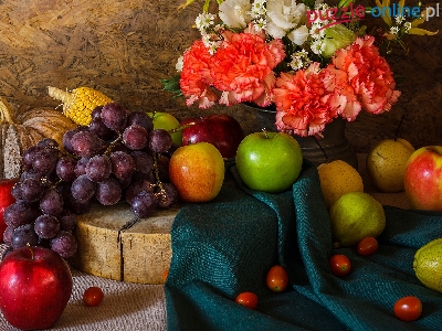 Winogrona, Wazon, Materiał, Cytryna, Dynia, Jabłka, Kukurydza, Goździki