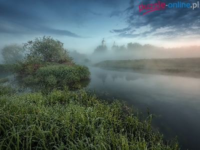 Trawy, Cerkiew, Mgła, Drzewa, Rzeka