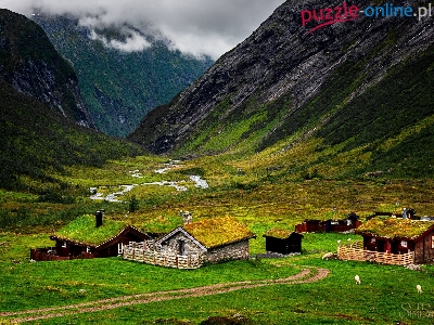 Dolina, Domy, Droga, Drzewa, Góry, Rzeka, Zagrody