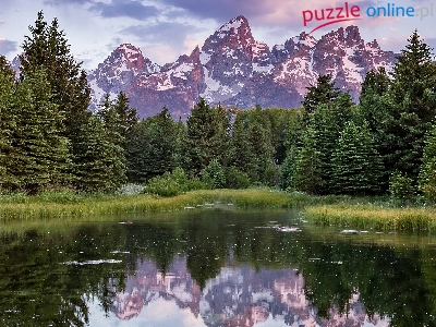 Rzeka Snake River, Stany Zjednoczone, Odbicie, Góry Teton Range, Trawy, Park Narodowy Grand Teton, Drzewa, Stan Wyoming