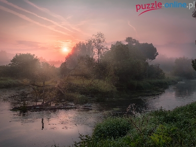 Rzeka Istra, Mgła, Rosja, Wschód słońca, Drzewa, Obwód moskiewski