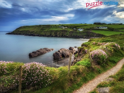 Skały, Kwiaty, Ogrodzenie, Niebo, Morze, Wybrzeże, Ścieżka