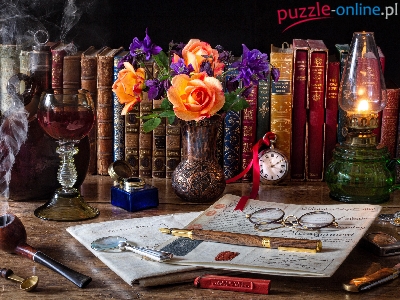 Lampa naftowa, Róże, Okulary, Kwiaty, Kompozycja, Fajka, Dym, Książki, Wazon, Kałamarz