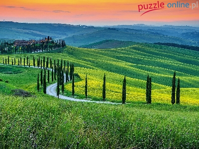 Toskania, Droga, Wschód słońca, Domy, Włochy, Wzgórza, Cyprysy
