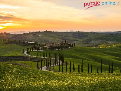 Toskania, Wschód słońca, Droga, Wzgórza, Domy, Włochy, Drzewa, Cyprysy