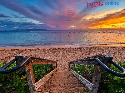 Morze, Chmury, Schody, Plaża, Zachód słońca