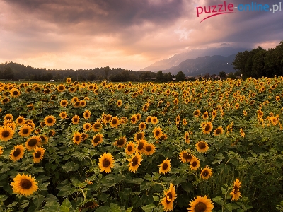 Puzzle Drzewa, Słoneczniki, Plantacja, Chmury