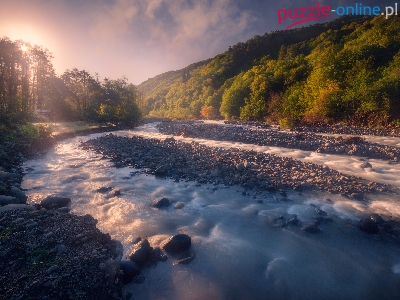 Rzeka, Kamienie, Wschód słońca, Poranek, Drzewa