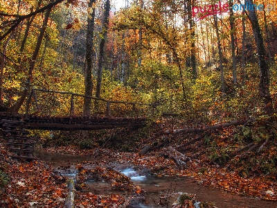 Drzewa, Mostek, Jesień, Las, Rzeczka