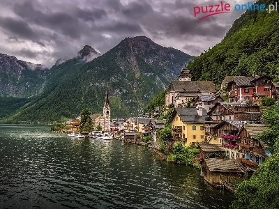 Alpy Salzburskie, Austria, Hallstatt, Góry, Kościół, Jezioro Hallstattersee, Domy, Powiat Gmunden
