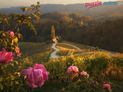 Pola, Wzgórza, Róże, Góry, Droga, Dom