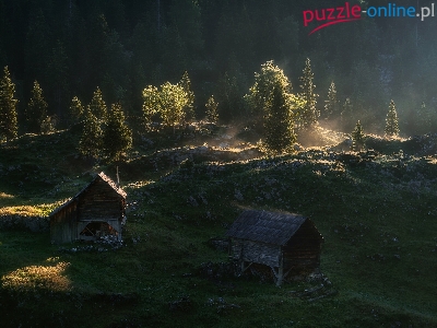 Szałasy, Drewniane, Poranek, Wzgórze, Domki, Drzewa