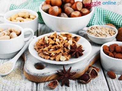 Pistacje, Orzechy, Miseczki, Deska, Ścierka, Anyż, Bakalie, Migdały, Drewno