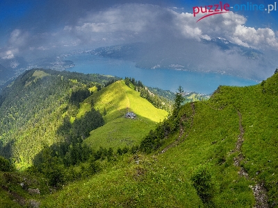 Jezioro, Szczyty, Drzewa, Chmury, Stok, Lasy, Góry, Ścieżka, Nasłoneczniony