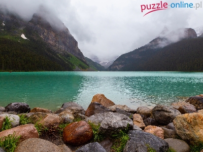 Brzeg, Drzewa, Mgła, Góry, Jezioro, Kamienie, Las