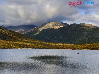 Góry Kołymskie, Rosja, Kołyma, Chmury, Łódka, Jezioro Jack London, Jesień, Obwód magadański