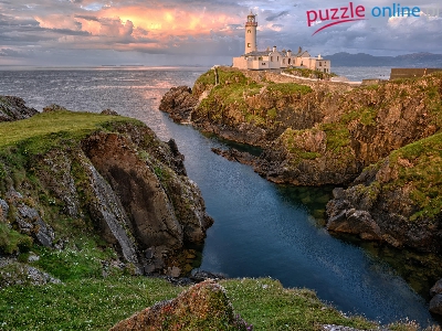 Fanad Head Lighthouse, Irlandia Północna, Portsalon, Skały, Zachód słońca, Latarnia morska, Chmury, Hrabstwo Donegal