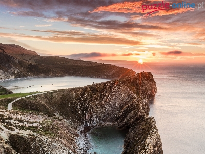 Skały, Anglia, Zatoka Lulworth Cove, Wzgórza, Chmury, Morze, Wschód słońca, Hrabstwo Dorset