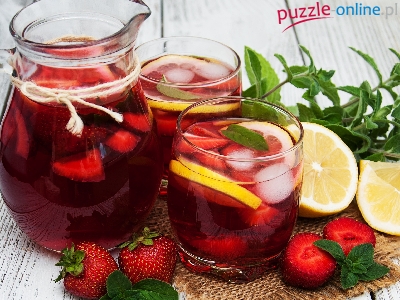 Mięta, Dwie, Lodu, Dzbanek, Serwetka, Cytryna, Truskawki, Napój, Szklanki, Kostki