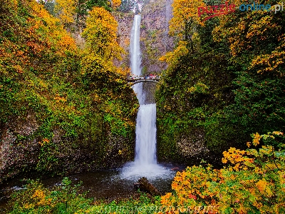 Most, Jesień, Roślinność, Hrabstwo Multnomah, Stany Zjednoczone, Drzewa, Wodospad Multnomah Falls, Skały, Oregon