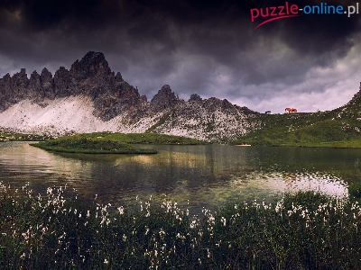 Szczyt Monte Paterno, Dolomity, Chmury, Góry, Kwiaty, Ciemne, Włochy, Paternkofel, Jezioro