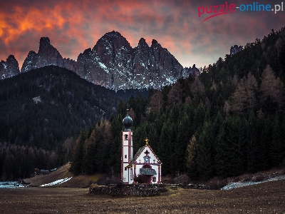 Las, Włochy, Dolomity, Dolina Val di Funes, Góry, Kościół św. Jana, Masyw Odle, Zachód słońca
