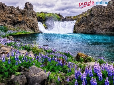 Rzeka, Skały, Łubiny, Niebo, Islandia, Kwiaty, Wodospad Hjalparfoss, Kamienie, Chmury