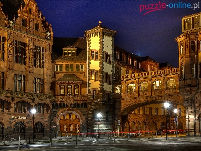 Domy, Nocą, Restauracja, Miasteczko, Uliczka, Ratusz