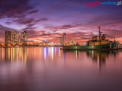 Morze, Gold Coast, Niebo, Zachód słońca, Australia, Wieżowce, Miasto, Łódka, Stan Queensland