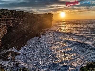 Klif, Chmury, Morze, Skały, Wschód słońca