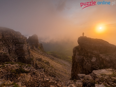 Skały, Kaukaz, Promienie słońca, Płaskowyż Bermamyt, Rosja, Człowiek, Góry, Mgła, Republika Karaczajo-Czerkiesja