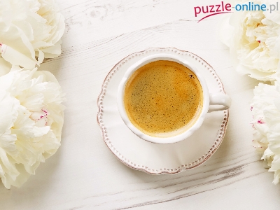 Kwiaty, Filiżanka, Piwonie, Kawa, Talerzyk, Białe