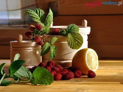 Drewniane, Maliny, Kompozycja, Gałązka, Cytryna, Pojemniki