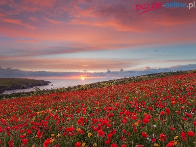 Puzzle Kwiaty, Zachód słońca, Łąka, Maki