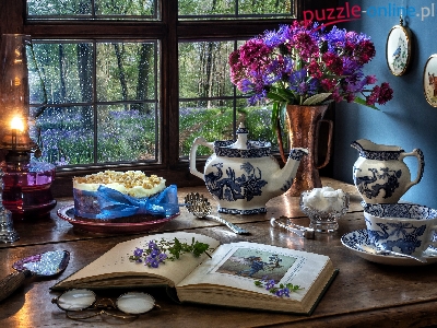 Okno, Książka, Filiżanki, Ciasto, Bukiet, Lampa naftowa, Kwiaty, Herbata