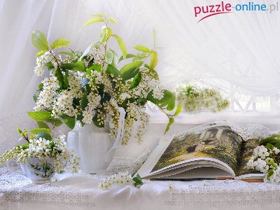 Kwiaty, Wazon, Książka, Bukiet, Gałązki, Czeremcha, Filiżanka