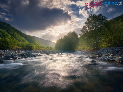 Kamienie, Drzewa, Góry, Rzeka, Chmury