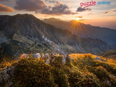 Zachód słońca, Roślinność, Rumunia, Kamienie, Góry Fogaraskie, Promienie słońca, Chmury